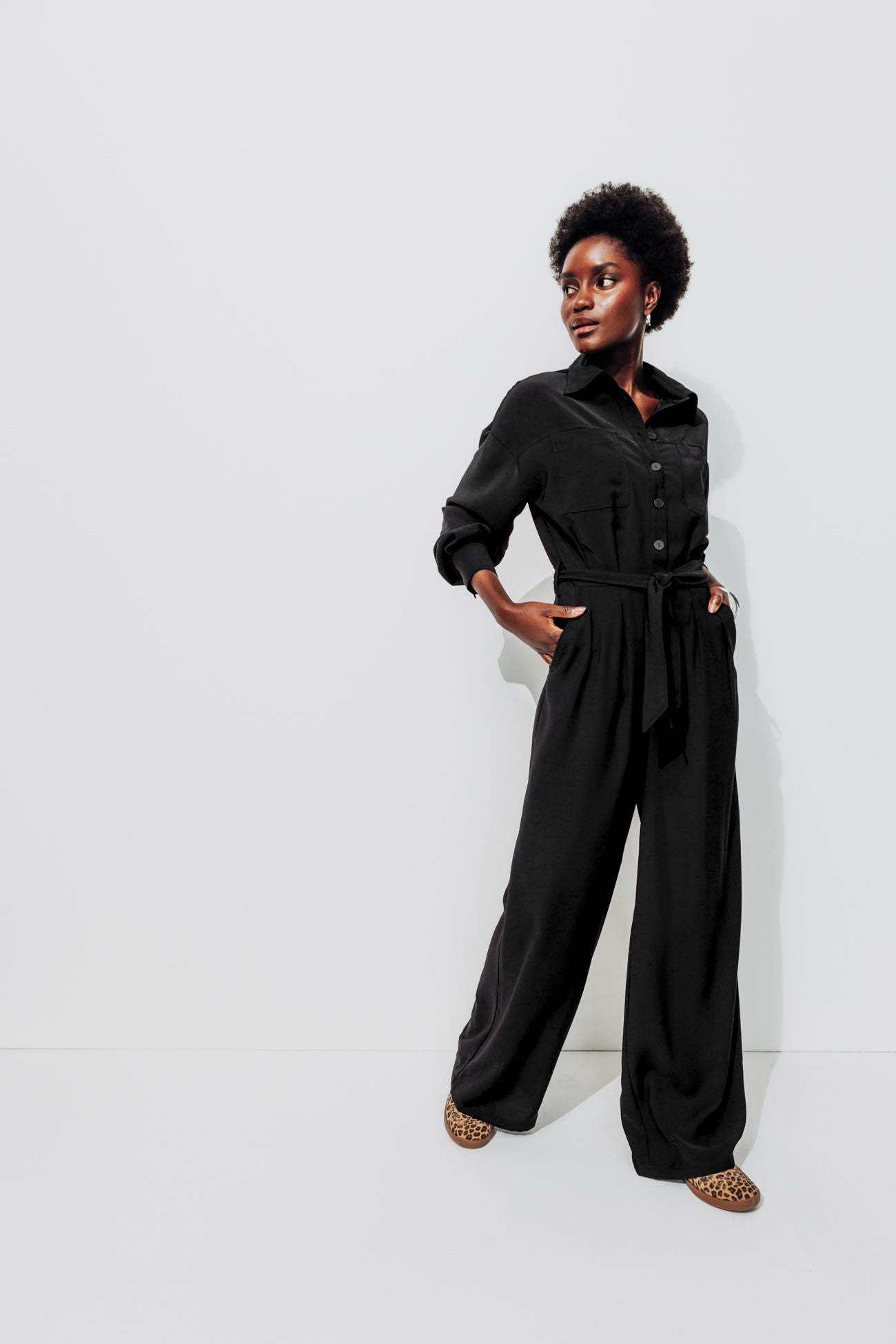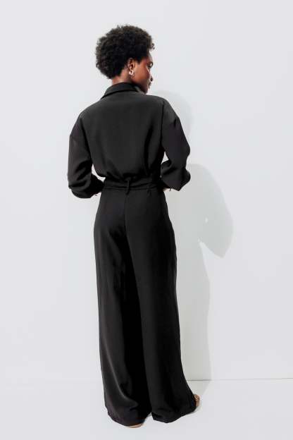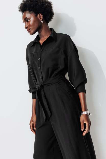 L'allure est élancée : avec cette combi-pantalon, on a envie d'avancer à grandes enjambées à travers la ville, la soirée, la vie... ! Haut façon chemise avec col à revers, ouverture boutonnée, 2 poches poitrine, manches longues, poignets boutonnés. Taille marquée, passants, ceinture à nouer (amovible). Jambes longues et larges, pinces. 2 poches italiennes. Contient des fibres recyclées.